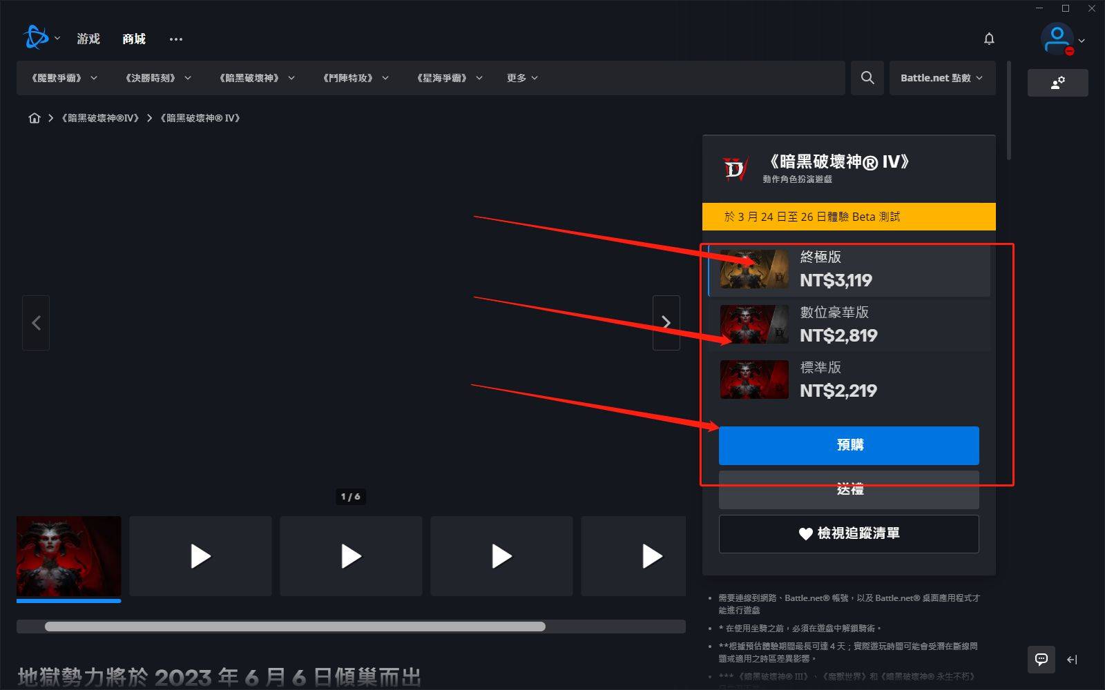 第五步:在战网中搜索找到【暗黑破坏神4】,选择自己想要购买的版本,点击预购就可以了。