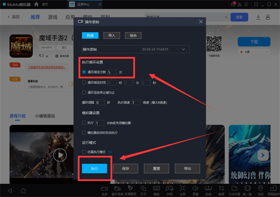 第四步:在完成操作录制后,把循环次数设置为5次进行测试,保证能够完成循环刷金,如果一直失败,也可以前往MuMu游戏社群找到已完成的文件直接使用。