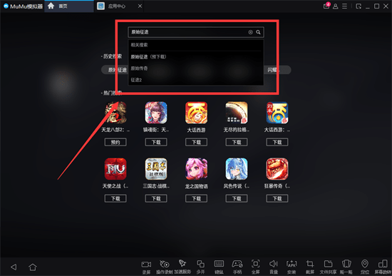 第二步:打开MuMu模拟器,在模拟器首页上方点击进入搜索栏,并输入【原始征途】