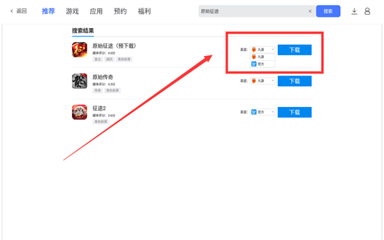 第三步:在搜索结果里排在第一个的就是原始征途手游,在右边可以切换自己想要游玩的服务器,是渠道服还是官方服务器,然后点击下载,即可一键完成游戏下载与安装。