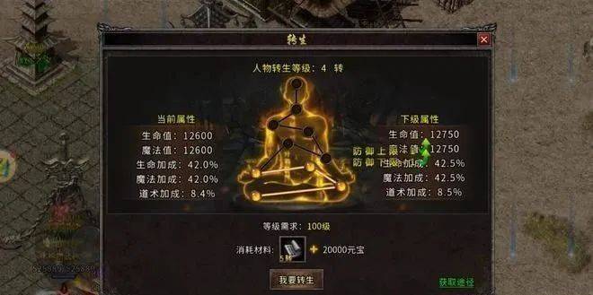 转生功能:消耗转生证明和元宝可以获得基础加成和百分比加成,代价很小收益却很大,自身装备属性越高,这个功能提升的属性就越恐怖。转生证明的获取渠道非常广泛,各个副本都可以掉落,对应转生等级要使用对应等级的转生证明,所以需要慢慢向高级副本推进。元宝几乎到处都可以获得,这里不做太多说明。