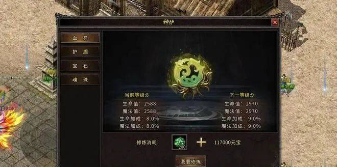 神炉:可以消耗这几种物品的碎片来修炼等级,获得基础和百分比加成,以及类似暴击伤害这种特殊属性。加成较小,价值在于其有特殊属性,所以很重要。碎片可以通过打怪和游戏内的各种活动获得。