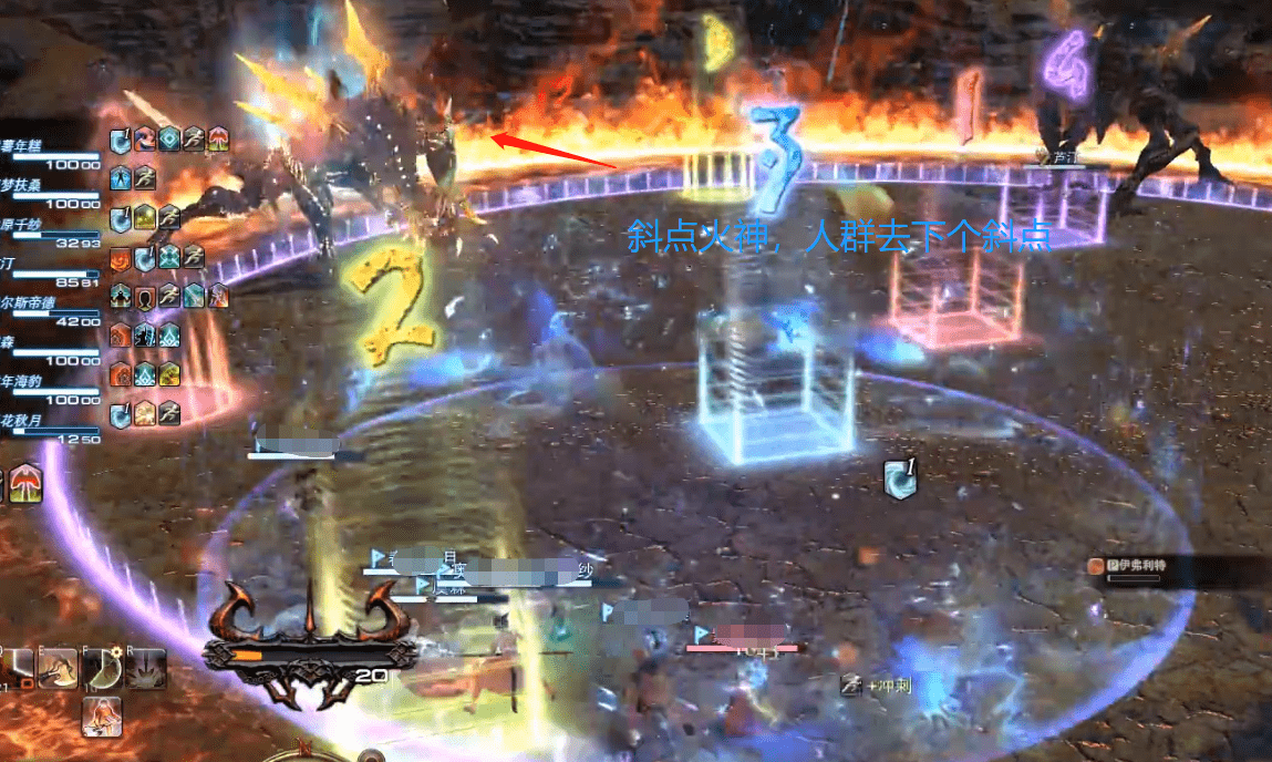 炸柱子由d3d4去引导,确保每根柱子要被两次火圈炸到,方可觉醒。起跑位置根据柱子出现的方向,为等腰梯形的两个锐角方向,绕场边跑,前往mt所在位置,等待火神冲机制。