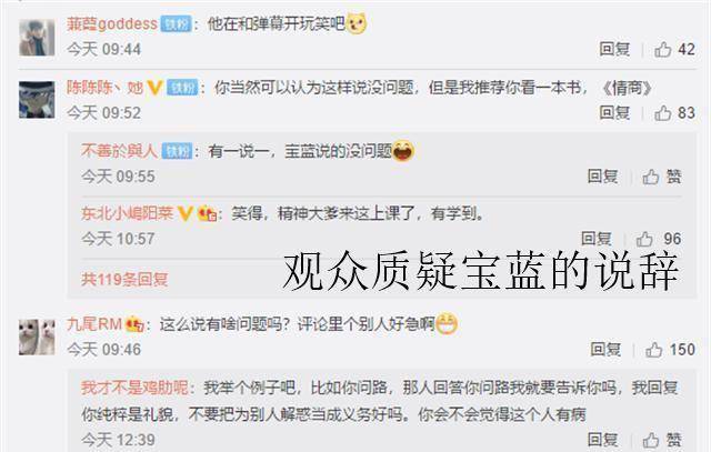 宝蓝受不了这个问题,直言:基地里还有谁,这种问题需要向你反映吗?我只是礼貌的回答,别把这当成我的义务好吗?看到这里,有人在刷《各过各的》、《我们也不想知道》,还有人在刷“我急”。