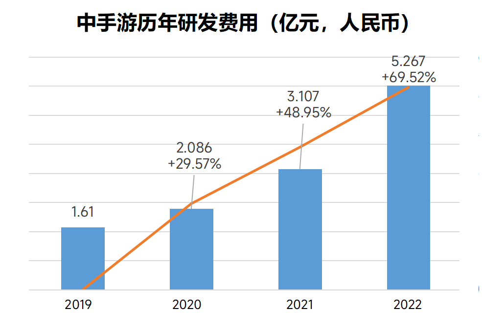 近年中手游持续加大研发业务投入。财报显示,2022年,公司的研发投入从2021年的人民币3.11亿元,增长至2022年的5.27亿元,同比增长69.5%。