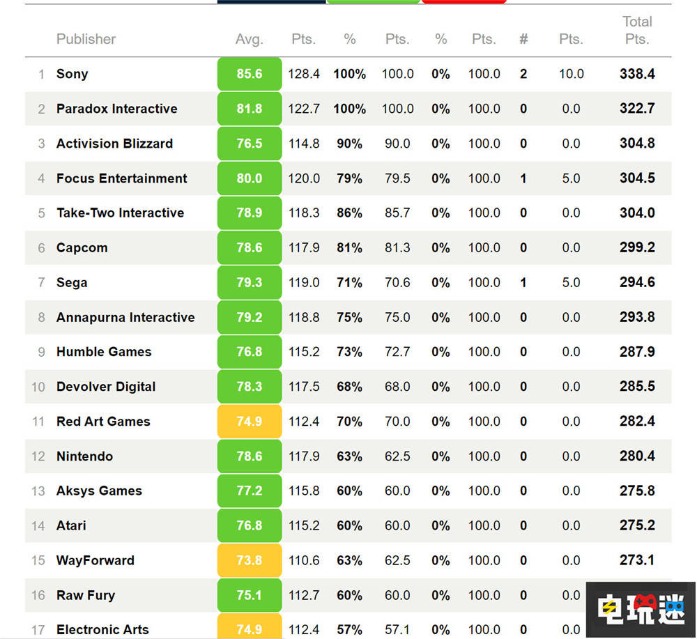 综合评价站Metacritic公开了其第十三届2022年度游戏发行商排行,其中由于第一方作品的实力强劲,索尼互动娱乐以平均85.6分排名第一。随后跟进的是俗称“P社”的瑞典发行商Paradox Interactive,第三名则是保有“欧美喜爱福”《使命召唤》系列的动视暴雪。