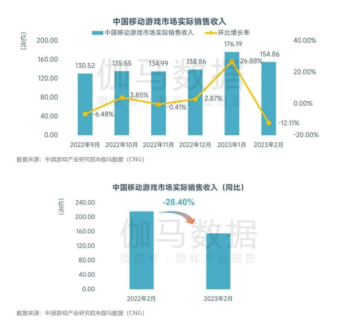 与此同时,伽马数据最新发布了《2023年2月游戏产业报告》,2月国内手游和出海数据继续保持下滑态势,中国移动游戏市场实际销售收入为154.86亿元,环比下降12.11%,同比下降28.40%,中国自主研发游戏海外市场实际销售收入为12.39亿美元,环比下降8.76%。
