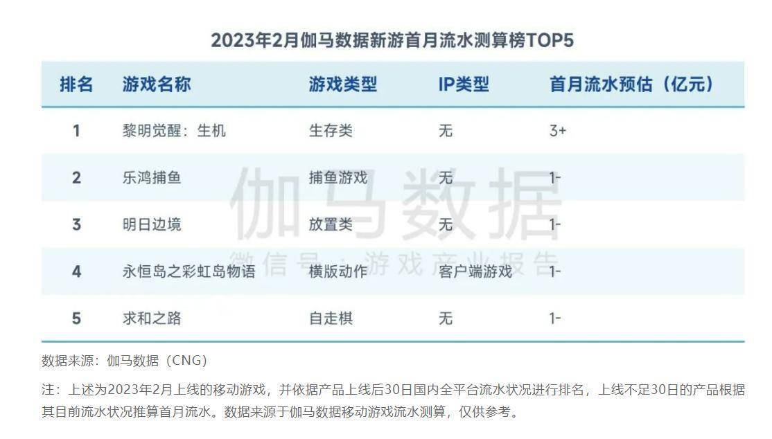 根据2月报告显示,2月新游首月流水榜TOP5中《黎明觉醒:生机》登顶,预估首月流水超3亿元,二其余产品表现一般,首月流水预估小于1亿元,且均未进入伽马数据流水测算榜TOP200。