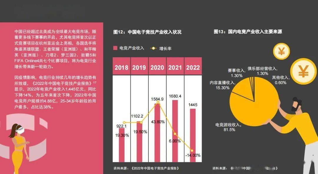 因疫情影响,电竞行业持续几年的增长趋势有所放缓,《2022年中国电子竞技产业报告》显示,2022年电竞产业收入1445亿元,同比下降14%,为五年来首次下降,2022年中国电竞用户规模约4.88亿,25-34岁年龄段的用