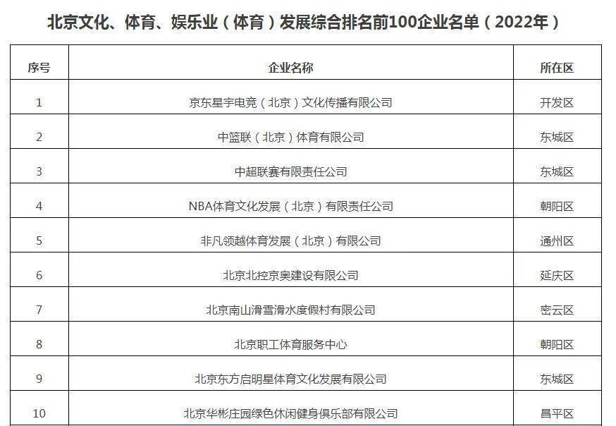 在北京市综合排名前100的企业中,大多都是业内知名的体育企业。比如,排名第二的是中篮联(北京)体育有限公司(俗称“CBA公司”),排名第三的是中超联赛有限责任公司,排名第四的是NBA体育文化发展(北京)有限责任公司,排名第五的是非凡领越体育发展(北京)有限公司(即公众所熟知的港股上市公司“非凡中国”)。