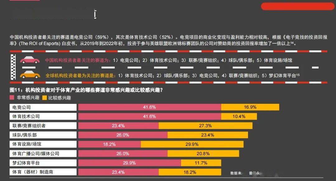 3月22日,普华永道发布《全球体育行业调研(第七期)中国报告》(简称《报告》)。该《报告》是基于对全球43个国家和地区的507位体育行业高管的问卷调查基础上进行分析整理而成。《报告》显示,中国机构投资者最关注的前五大体育赛道为:电竞公司(58.5%)、体育技术公司(52%)、联赛/竞赛组织(50.7%)、球队/俱乐部(49.4%)、体育设施/场馆(48.1%)。相比之下,在全球范围内,全球机构投资者最热衷于投资的是体育技术公司,其次是球队/俱乐部,而电竞则只排名第三。对比之下,中国机构投资者对电竞公司的热情远超国际同行。