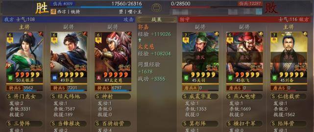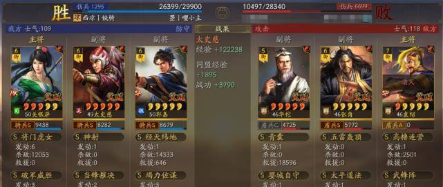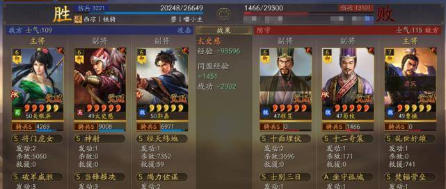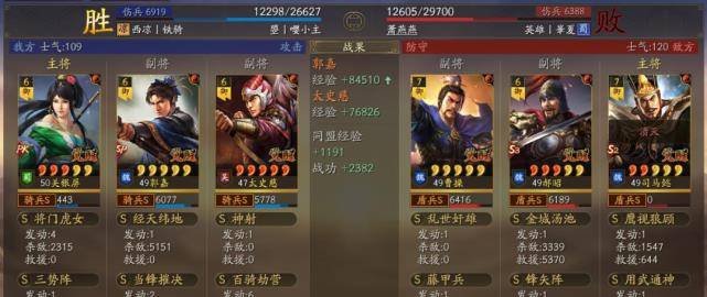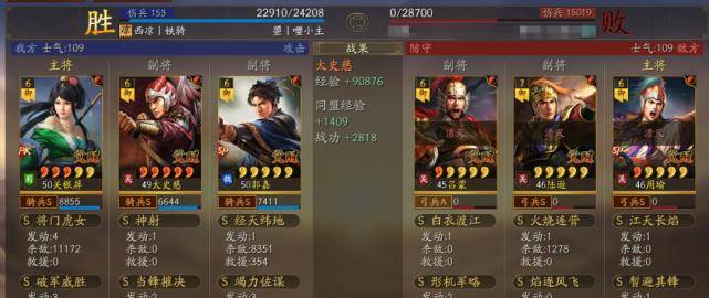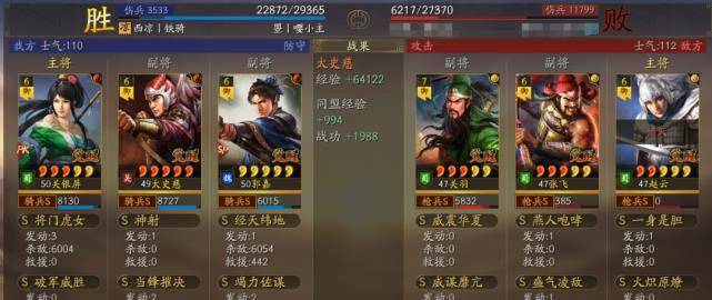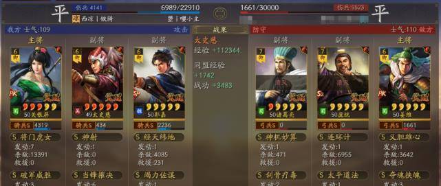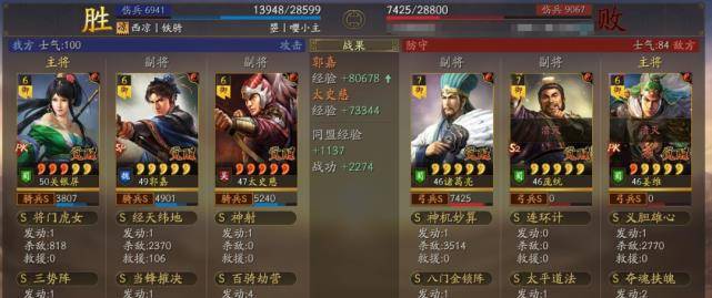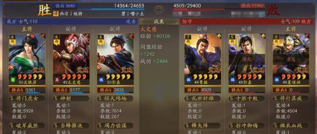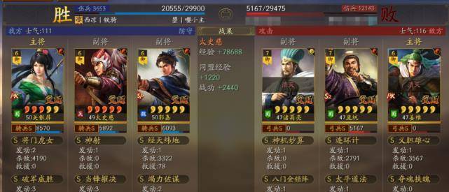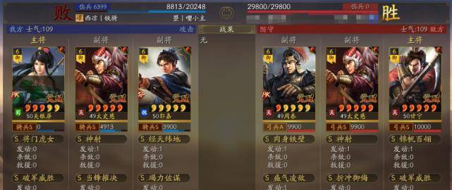 以多段伤害为主据水断桥、轻勇飞燕、横扫千军,暴敛四方,火智原燎。也可以带破军威胜和太史慈联动打掉统率的速度非常快,让太史慈和关妹都能破军伤害