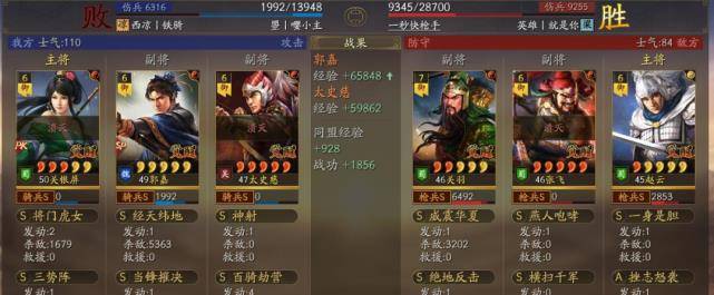 三战防御分三种(减伤、治疗、控制)这个阵容我认为没有格子再放减伤战法,所以防御全靠本身的控制,爆发力也不足关太夏海量减统的猛劲,所以郭嘉也要补上控制拖打回合,再利用智力优势补上治疗战法跟进续航