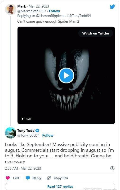 在电影《漫威蜘蛛侠2》中饰演毒液的演员托尼·托德在推特上回应一位粉丝透露,这款游戏显然定于9月推出,从8月开始就大肆宣传。广告将在八月出现。