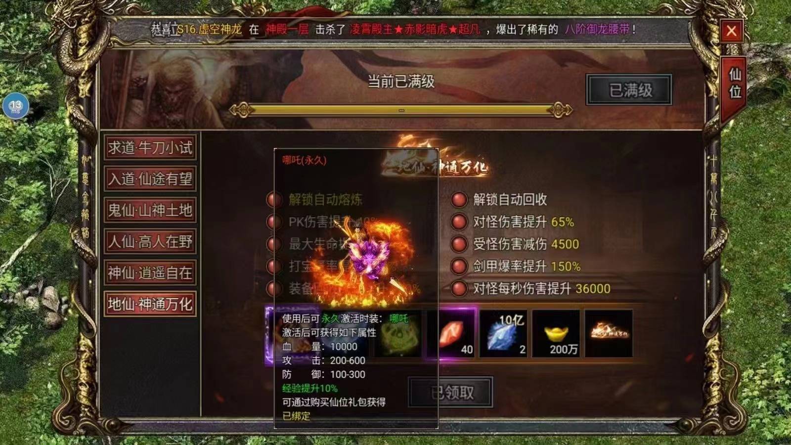 开通地仙仙位后,很多装备资源都是免费领取的。可以直接把转生等级提升到11转,前面慢慢打转职书还是比较漫长的。还有11转的巨门吸血武器,更是打boss都不掉血,纯纯的就是换血大法,身上没有一滴血是自己的,全是吸的。第一天直接升级到地仙,游戏内的累冲礼包也能直接免费领取,大量的宝石和元宝,前期正是元宝稀缺的时候,元宝资源还是非常重要的。