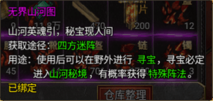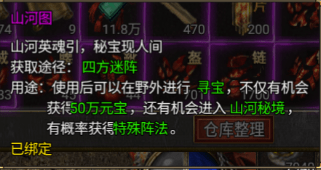 山河秘境是参加每周2、周5晚上的四方迷阵之后可以进入的图,获得无界山河图之后就可以使用进入山河秘境,这个里面就是一个开宝箱的地图,一共12个宝箱需要灵符开启,每次开启宝箱消耗的灵符递增,最后一个可以开到麻痹S特殊阵法,总共需要10W+灵符,折后就是500RMB左右,如果有双倍灵符档位存在那折后就是250左右。