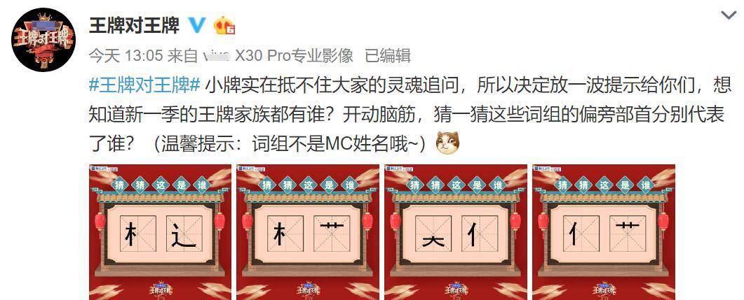 在粉丝的不断追问下,官方《王牌对王牌》终于坐不住了,第一时间公布了第五季的MC名单。不知道。节目组发文,《小卡真的抵挡不住大家的灵魂质疑,所以决定放一波回忆给大家,想知道新一季贾玲家族是谁?开动脑筋猜一猜》这些句子的部首代表什么。谁?(提示:句子不是MC的名字~)”,正文下方有四张图,这四张图分别代表贾玲家族的四位成员,你能猜到吗??
