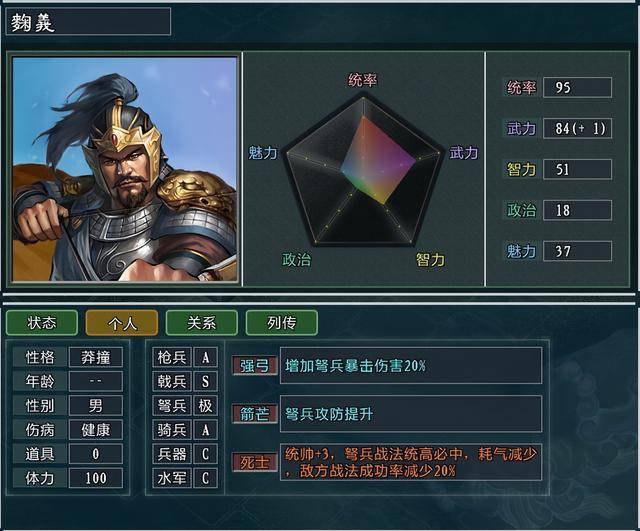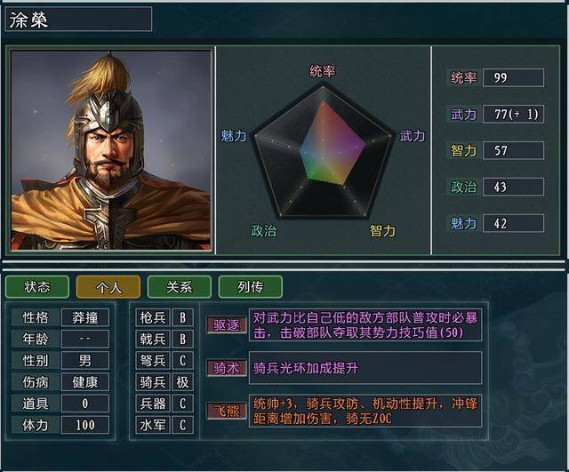 统率+3,骑兵攻防、移动力提升,冲锋距离增加伤害,骑无ZOC。