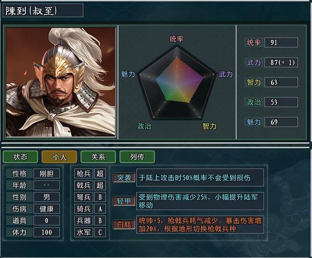陈到在《演义》中并没有出场,在原版英才济济的刘备阵营中,也是个白板的酱油角色。不过相传作为蜀汉强力的“