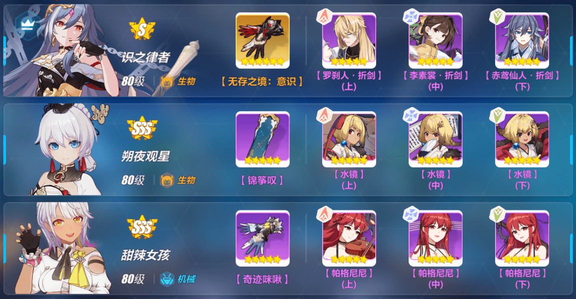 如果没有水镜套的话可用糖泳牛代替。阵容以识律为输出核心,其余两个辅助位可以在观星、格蕾修和卡萝尔之间三选二就行,哪两个装备好就用哪两个。