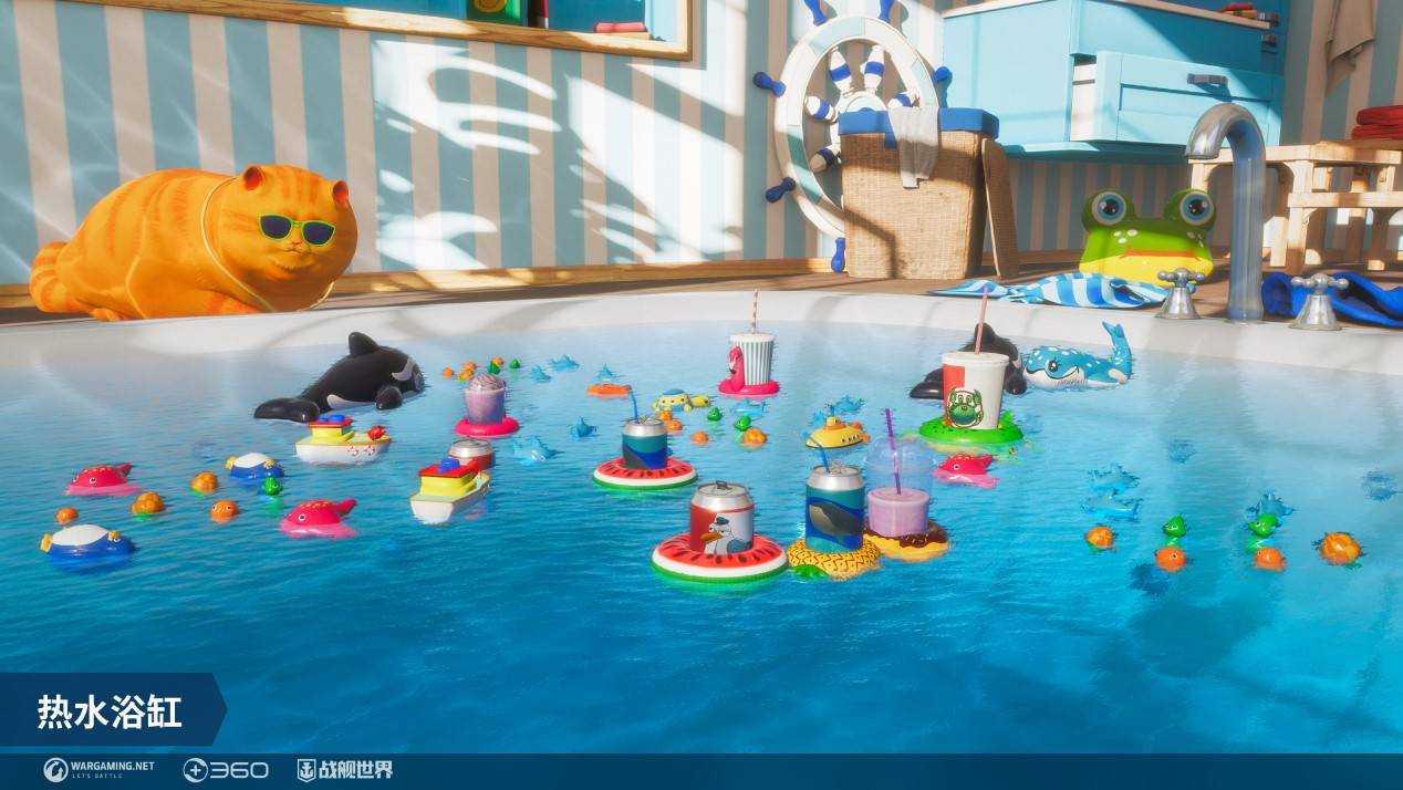 澡盆乱斗,顾名思义就是地图换成了洗澡的浴缸,船只也变成了橡皮鸭玩具,就像小朋友洗澡时的玩具一样。初始只能选择3只舰船,在这一模式种获得指定数量的经验以后,就能够解锁后续的舰船使用权了。最终驱逐、战列和巡洋各2艘,驱逐舰装备了气泡鱼雷和高爆水泡,巡洋舰装备了高爆水泡,战列舰装备了穿甲水泡。除此之外,在这一模式里还有新的攻击武器——冒泡鱼雷。它们的埋设方法类似于投掷深水炸弹;但是,这些水雷不会沉下去。水雷在一段时间后或与其他橡皮鸭接触时爆炸,而且会导致进水。