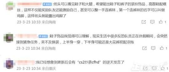 因此有玩家就表示希望能出高跟鞋加黑色,这样不仅能激励自己还能奖励队友,还有玩家脑补出了大花裤衩加拖鞋的造型,也有玩家觉得这样搞可能会被一些玩家《CS2》吐槽抄袭《CF:HD》。