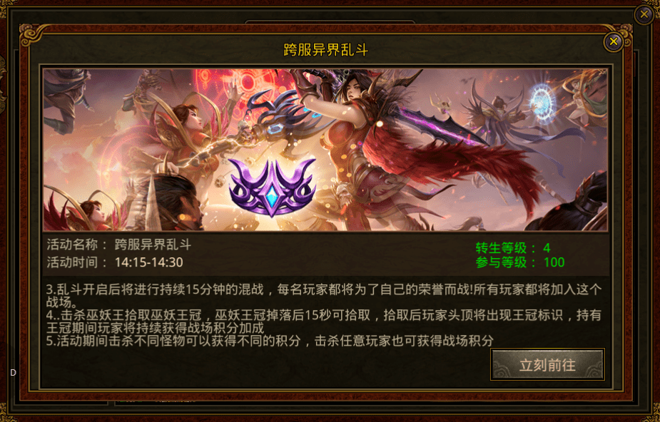 异界乱斗是在开服的前7天周二,周四,周六,下午14:15至14:30开启。