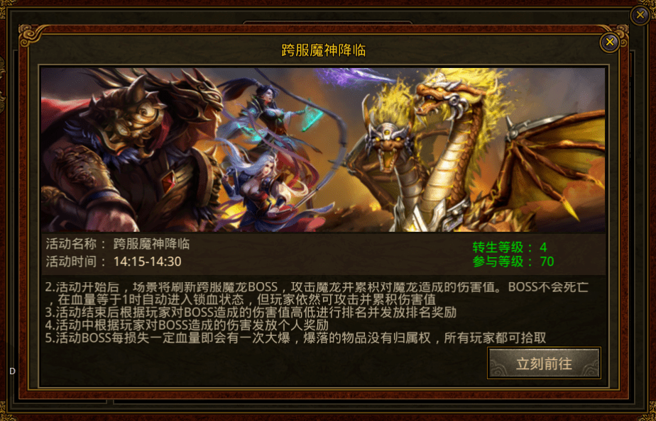 开启后服务器所有玩家可以在同一场景参与玩法,并开始激情的对抗,此boss每次血量降到一定的数值,都会进行一次奖励掉落,并根据对boss伤害排行榜一次进行不同的奖励发放