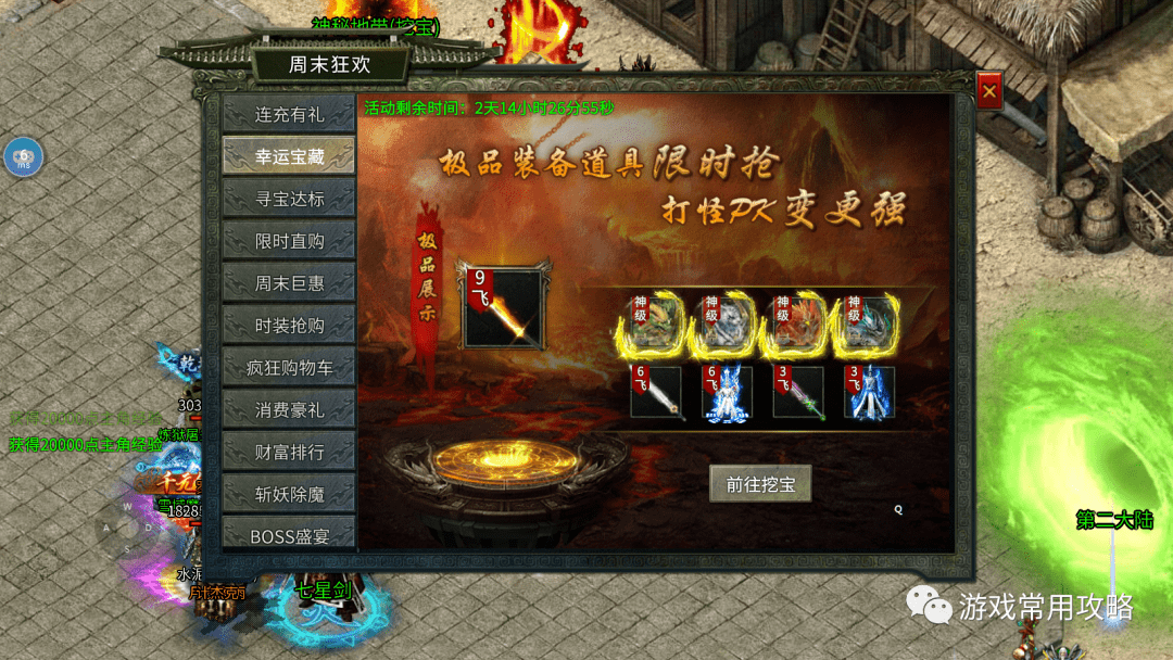 幸运宝藏:可以去地图挖宝,可以获得玄怒炎战剑,属性为:攻击+112100,防御+14010。需要到达9飞升才可以穿戴。还有4个千年魂兽,青龙,白虎,朱雀,玄武。