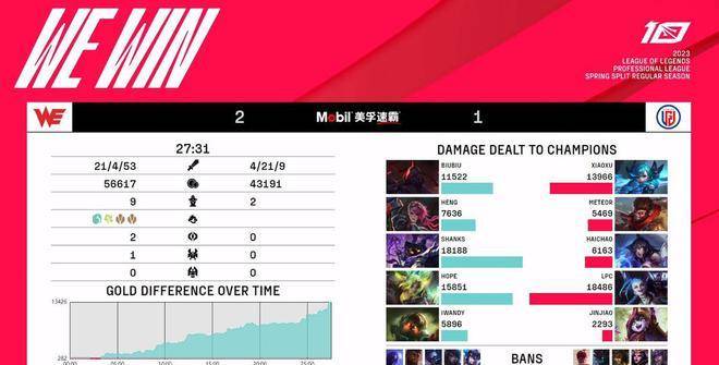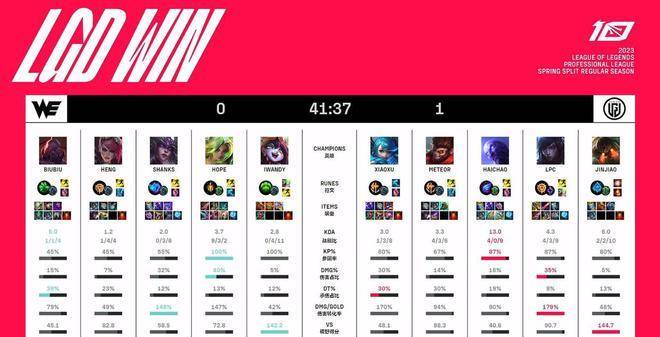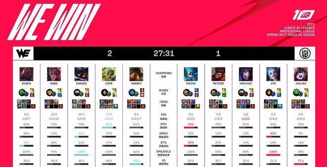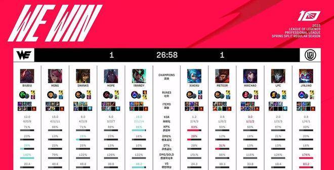 最终WE在27分钟稳稳推平LGD基地,让1追2拿下了这场关键的胜利,排名暂时超过稍后登场的RNG进入季后赛范围之内。