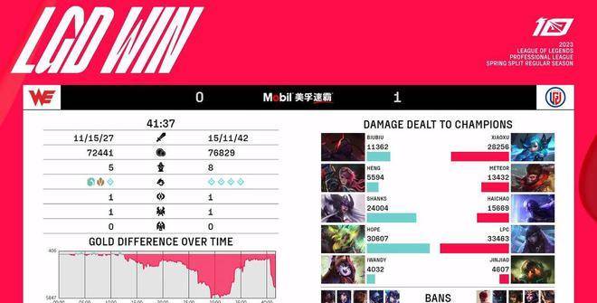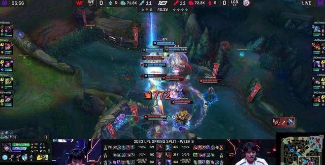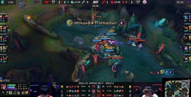 9分钟,LGD想要依靠格温上路的优势强打一波,但双人组两个五级打两个六级,战斗力根本不在一个层面,WE打出0换2抢下先锋,基本已经有点锁定胜局的意思在了。