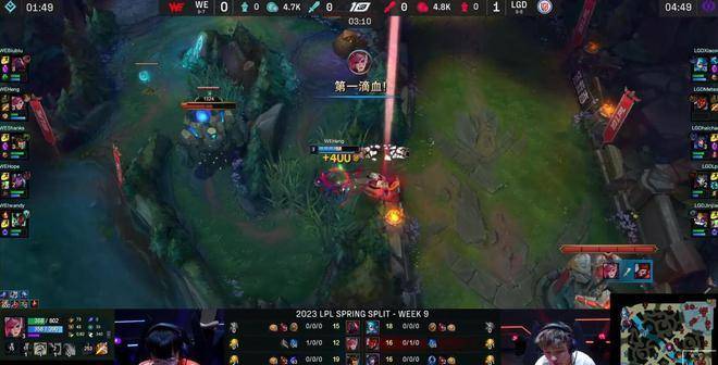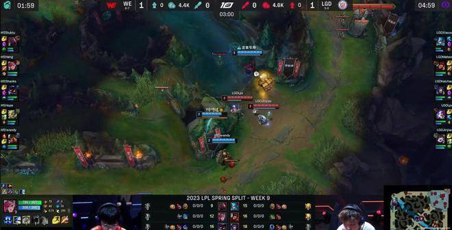 前期Heng精彩的绕视野打了LGD双人组一个措手不及,即便猴子就在不远处反蹲,但为时已晚,WE下路拿到一血,人头也是1换2的小赚。此后格温中路的一波游走被WE野辅反蹲到,导致原本上路有优势的格温阵亡。