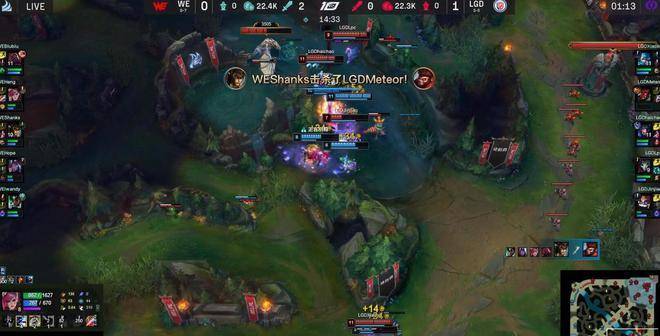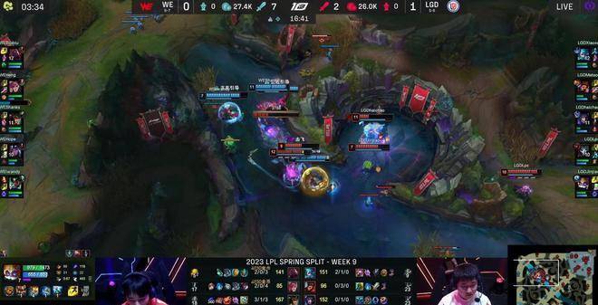 20分钟,WE依靠蔚的先手击杀大头,顺利控下听牌炼金龙,但后续的处理太贪了,被LGD抓到机会猴子开到卡尔玛,烬架狙留住维鲁斯,LGD突然发难打出0换3,选择Rush大龙。