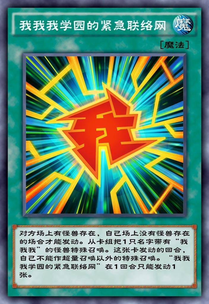 第三张卡我我我学园的紧急联络网不仅是动画中游马常用的救场卡,同时也是拟声系列的强力检索。这张卡厉害的地方在于对手场上有怪兽存在且自己场上没有怪兽存在的时候可以从卡组将一只名字带有我我我的怪兽特殊召唤,定向卡组检索展开非常霸道。要知道这种能从卡组定向检索且特召的卡牌在游戏王中一般都是非常罕见的,这张卡的出现极大程度减少了拟声的卡手率,丝滑程度拉满非常好用。