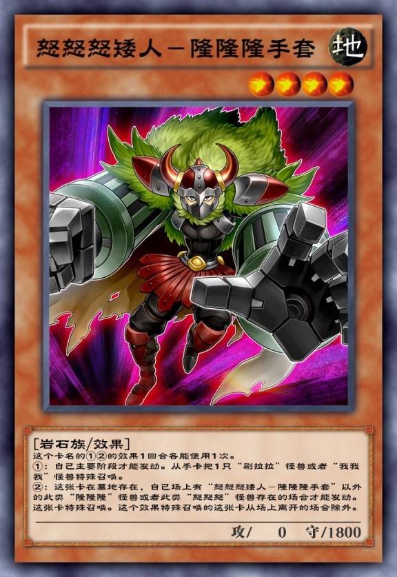 第二张卡怒怒怒矮人是拟声系列的泛用搭配卡,这张卡在场上的时候可以在自己主要阶段从手卡特殊召唤一只刷拉拉或者我我我怪兽,同样可以保证资源方面的调度,这点还是比较稳定的。而且这张卡在墓地存在的话,还可以在场上有隆隆隆或者怒怒怒怪兽存在的时候从墓地特殊召唤,继续展开做出更多的四星泛用同调,灵活性非常强,而这也正是拟声系列很少卡手的主要原因。