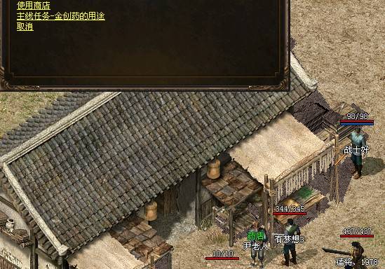 与饰品店NPC阿顺对话后, 获得厚布衣和金创药,双击厚布衣即可装备。鼠标左键点击药水,拖动到游戏下方快捷栏,使用时按相应的数字键即可。
