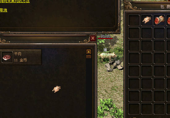 挖取的肉会自动进包裹内,点击 肉店NPC丰久 打开商店界面,鼠标左键将包裹内的肉拖动到商店界面出售物品,赚够100金币后交给村长。