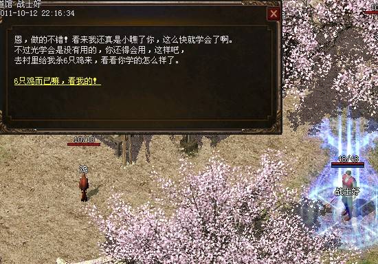 根据任务提示,在村落附近杀6只鸡,完成任务后再与战士高手 NPC 龙血先生 对话交任务。