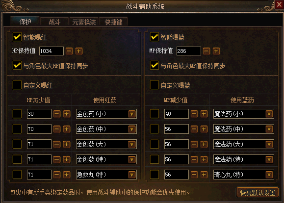 现在要出去练练身手了,按照任务提示, 杀10只稻草人。怪物死亡时会掉落金币,药水,装备等等, 角色站到物品上面即可自动拾取。野外怪物多,难免遇到危险,按TAB键打开战斗辅助系统,设置自动喝药保护角色了。