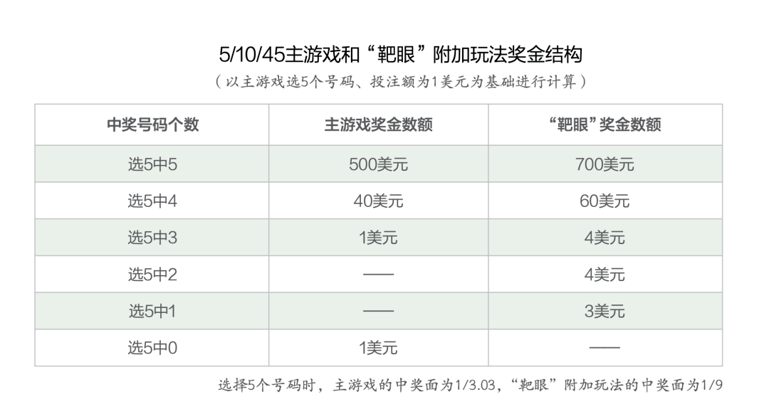 ★如果选择5个号码,则中0(无号码与中奖号码相符)、中3、中4、中5均可中奖,奖金分别为1美元、1美元、4美元和500美元,但中1和中2均无奖金。