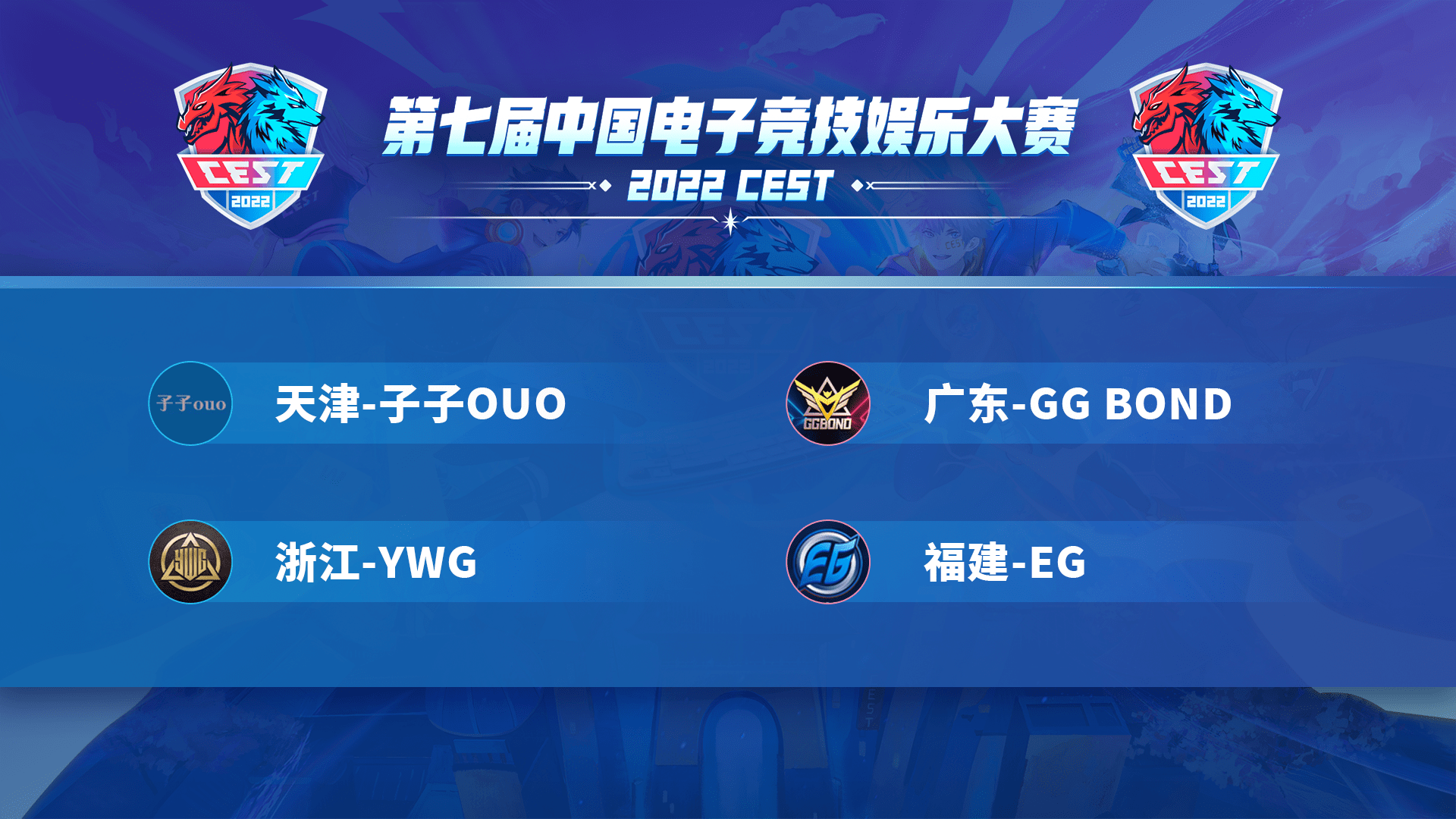 经过前期线上阶段的火热比拼,天津-子子ouo、广东-GG BOND、浙江-YWG、福建-EG四支战队成功突出重围,会师全国总决赛!本次大赛将采取现场抽签形式决定对战阵容,期待大家之后的精彩表现。