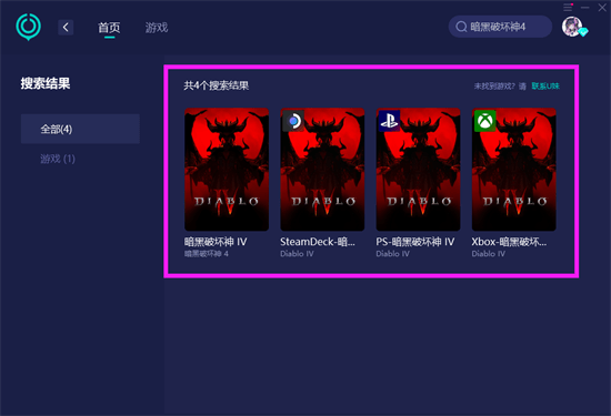 第二步:回到加速器首页,在右上角点击搜索【暗黑破坏神4】会出现4个加速选项,分别对应PC/SteamDeck/Xbox/PS,4个游戏平台,玩家根据自己需要游玩的主机平台进行加速。