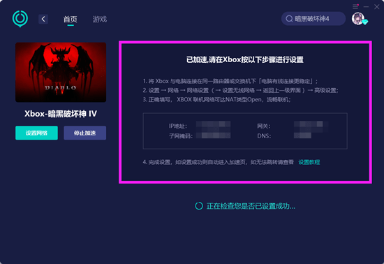 第三步:加速完成后,加速器会自动跳转至游戏加速页面,玩家们需要使用主机设备,根据UU加速器中给出的步骤,进行相应的网络连接设置,设置完成后即可成功连接上加速网络,进入游戏即可享受加速服务了,如果玩家不太理解该如何进行设置,可以点击步骤中的【设置教程】进行学习。