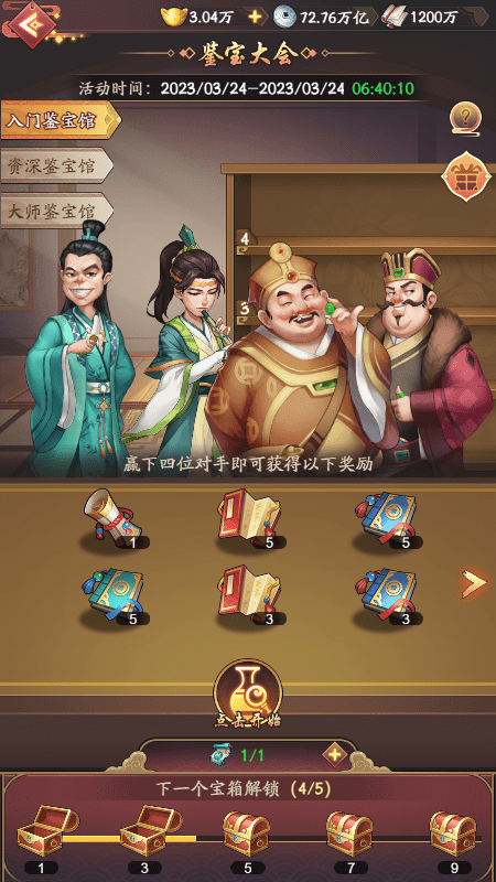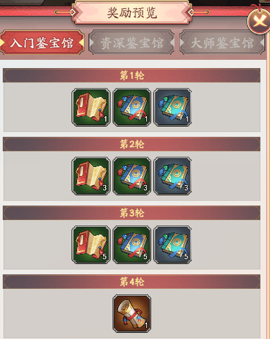 这个就是每个鉴宝馆里面全部胜利和胜利会获得上面到的,第一个就是我们的入门鉴宝馆里面第一轮到第三轮获得的道具都是一样的,只不过是数量不一样的,全部胜利的话就可以获得一个资质升级卷轴的。