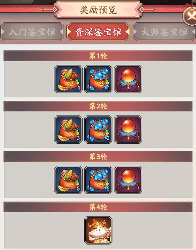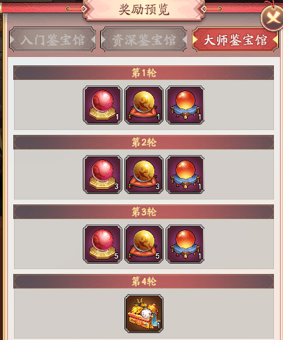 第三个是大师鉴宝馆的参与奖励了,他获得的奖励和资深鉴宝馆的道具是一样的但是要比他多一些就没有其他的区别了。