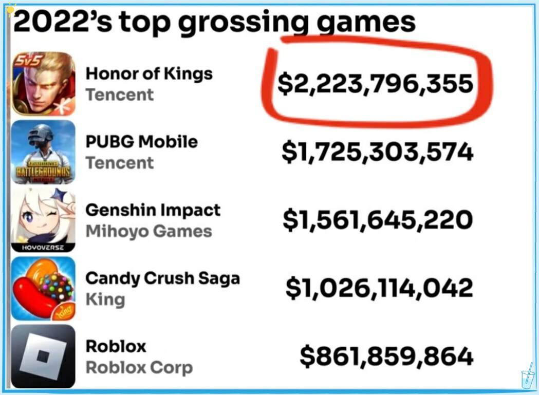 其实王者荣耀的收益情况一直都是比较稳定的,某机构的统计数据中就证明了王者荣耀在2022年的整体收益排在了第1名,而且这个收益的统计数据只是苹果区的而已。