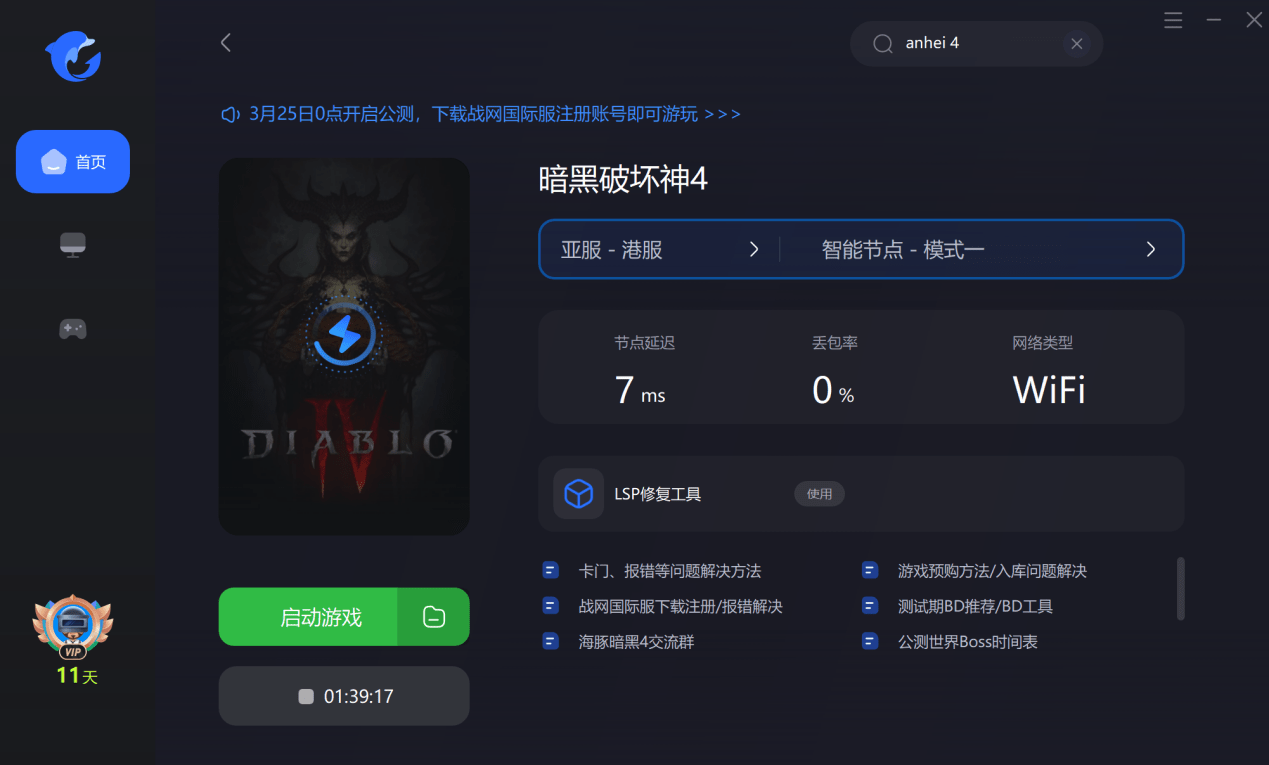 海豚加速工具最近还给玩家们提供加速福利,玩家们只需要通过下图简单操作,就能轻松领取到海豚加速工具的72小时免费加速时长,帮助玩家们加速体验暗黑4。