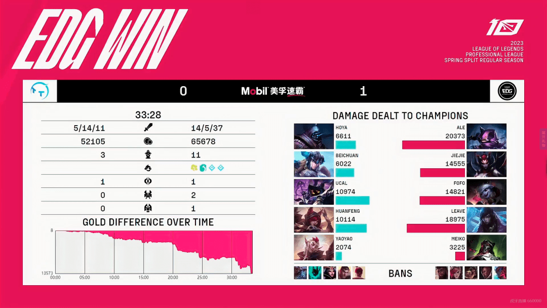 [33:00] EDG上单在对方高地主动开团,打出团灭,赢下本局比赛!
