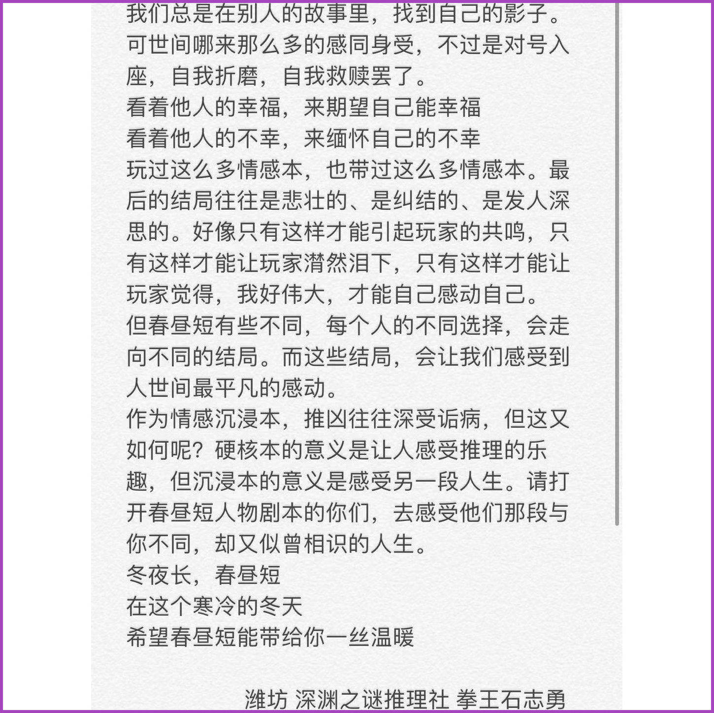诚如作者所言,“与其他情感本相比,没有错综复杂的关系,没有曲折离奇的身世,没有惊心震颤的演绎,有的只是几段简单而清丽的感情,每一段关系都不一样,但是感情都一样浓厚深刻。大家只需要用心体会自己所扮演角色的故事,根据自己对人物性格的理解,讲出自己最想说的话,游戏中没有一定要完成的任务做出自己的选择就好~”。用心体味这个本子,越沉浸越代入,这个本子的体验感会越好。