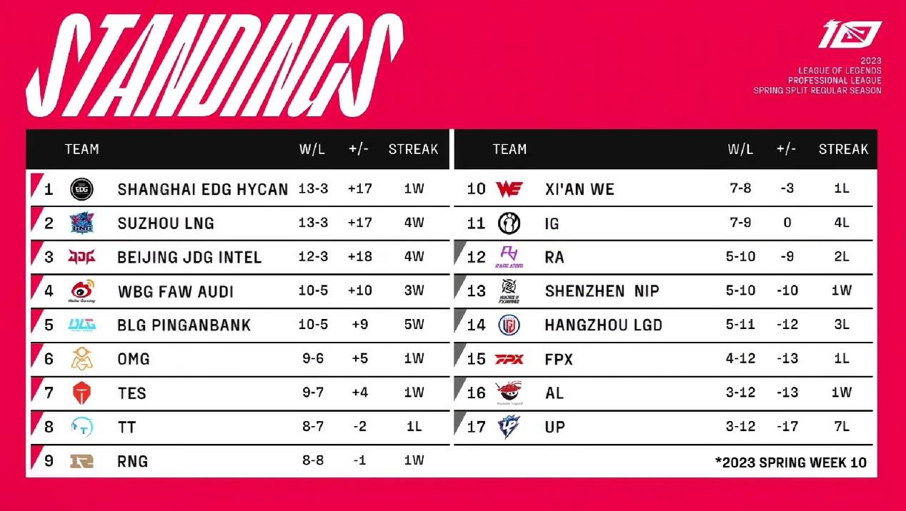 LPL春季赛常规赛进入最后的尾声阶段,在今天和明天两个比赛日过后就将正式尘埃落定,目前已经有多支战队排名稳定,季后赛半区分布也有了一些雏形。